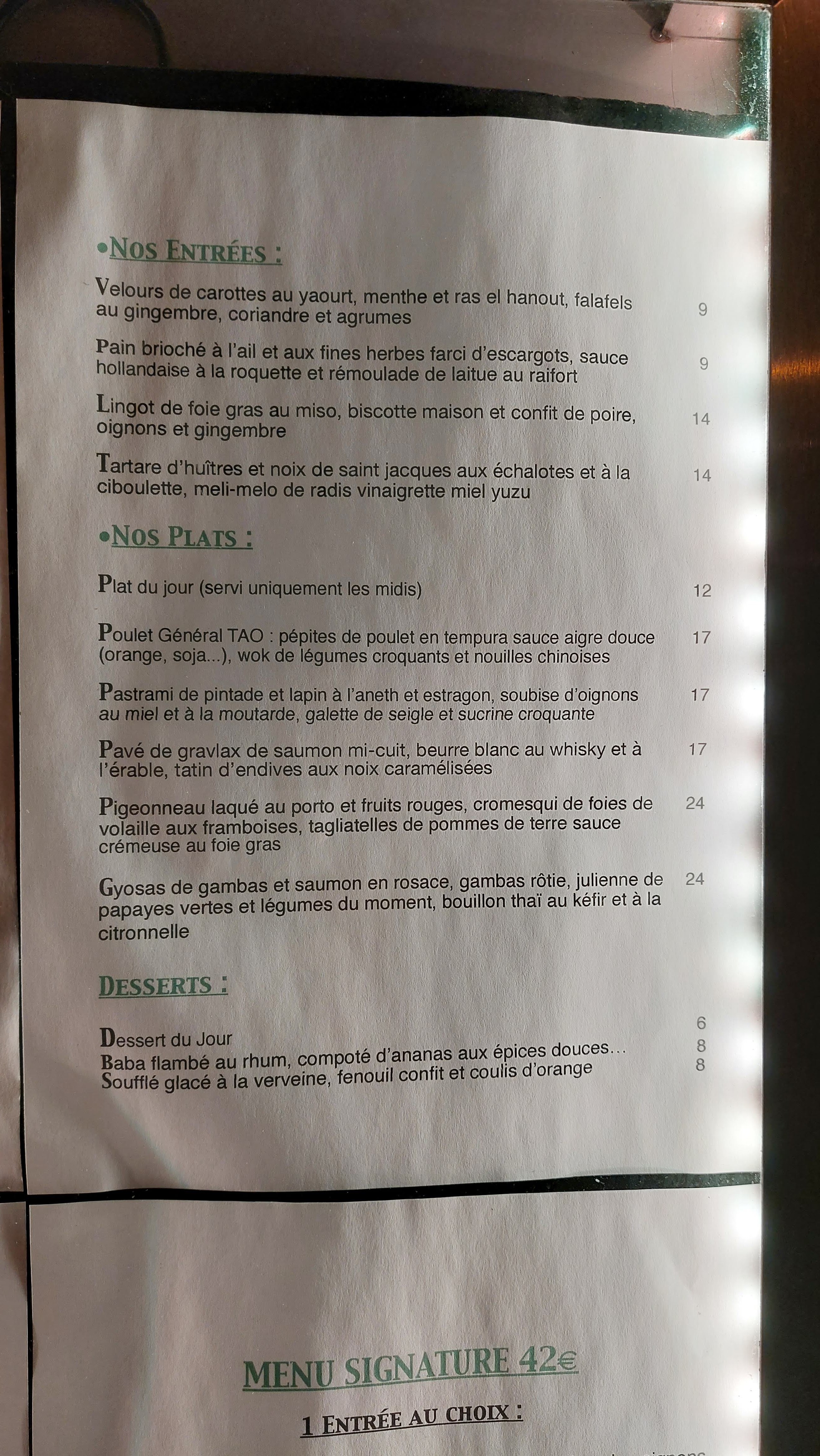 Ici, on ne mange pas comme à la maison ! L' inspiration du chef est marquée par les cuisines du monde. Les textures, les épices, les matières premières sont travaillés pour vous offrir des goûts originaux et délicieux. Dans une ambiance agréable et décontractée, l équipe en salle est ravie de vous accueillir et de vous servir avec des sourires et des attentions non feints. Merci pour cet excellent moment.