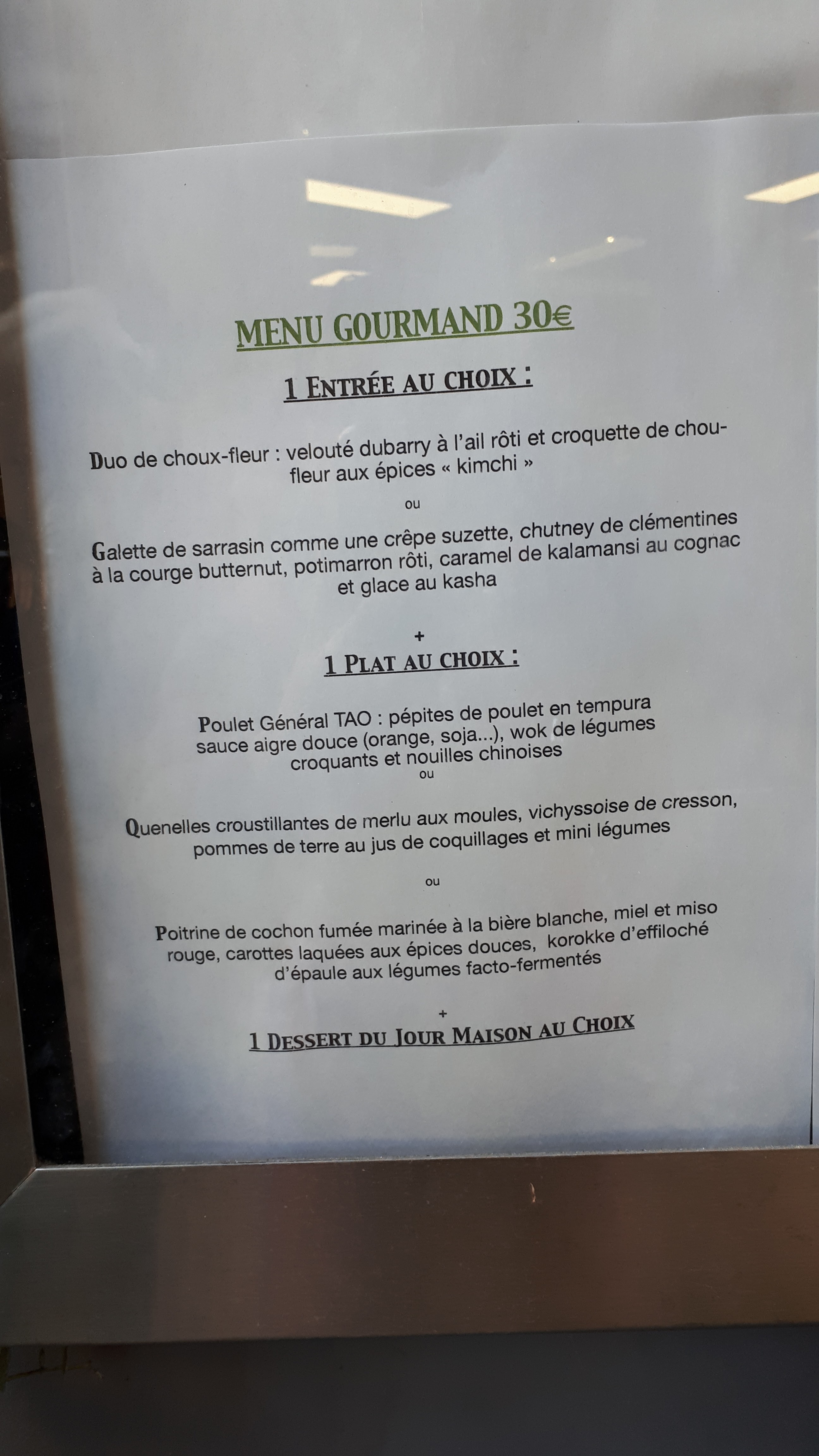Belle découverte, original, saveurs et produits relevés, les papilles adorent. Accueil fort sympathique, 1 serveuse disponible et très avenante et à l'écoute. Bravo aux cuistos pour leurs associations, épices...original, recherché, à tester pour passer 1 bon moment. 2 choix à 30 euros et 2 choix à 40 euros. On s'est régalées avec le menu à 30, copieux